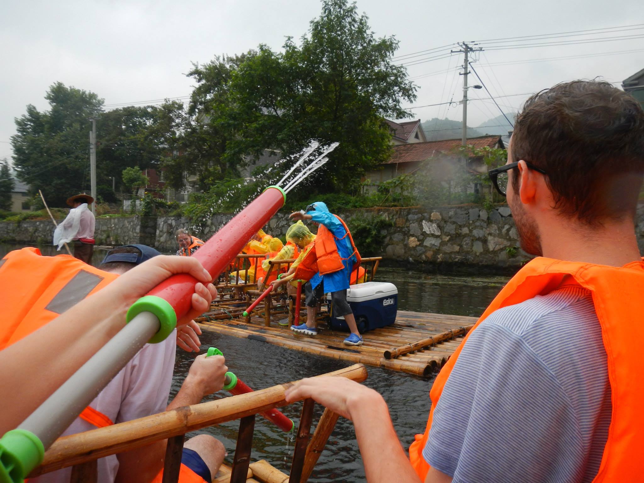 At this point, although it was an interesting (3 hour) bus ride, it was raining fairly hard and I did not think today was going to be a good day. Sitting on the river in the rain did not sound like much fun. Still, I had hope that maybe we would have a nice time. We arrived at the river to some very aggressive aquatics salespeople. They were peddling very cheap ponchos and high-powered water guns. More to come on that later. Several teachers brought their children along, and this trip was very popular already with them. Every single one of them was instantly armed with a water gun and already blasting us pedestrians as we tried to load up our bags with the important commodity: beer. We then made our way to the rafts.